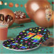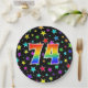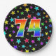 This fun, cheerful, and colourful paper plate design features a large number "74" coloured with a rainbow spectrum gradient inspired pattern. The background features a multicolored pattern of star shapes. Fun paper plates like this might be used at a celebration being held in honour of somebody’s seventy fourth birthday, or a couple’s seventy fourth anniversary, or some other 74th event. [~Z0000493]