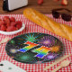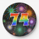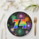 This fun, colourful, and cheerful paper plate design features a large number "74" containing a rainbow spectrum gradient inspired pattern colouring. It also features a exciting and vibrant bursting celebratory fireworks inspired pattern. It has a black coloured background. Fun paper plates like this might be used at a celebration being held to honour somebody’s seventy fourth birthday, a seventy fourth anniversary, or some other seventy fourth event. [~Z0000490]