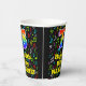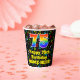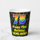 This joyful and colourful music-themed birthday paper cup design features a large number “75” having a rainbow spectrum gradient inspired pattern. It also features the message “Happy 75th Birthday,”, and a custom name. The background features an exciting and colourful pattern having music notes and symbols of various colours and sizes. Colourful, vibrant paper cups like this might be fun to use at a birthday celebration being held to honour somebody’s seventy fifth birthday. [~Z0000541]