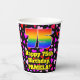 This colourful and cheerful birthday paper cup design features a large number “75” with a rainbow spectrum gradient inspired pattern, along with the message “Happy 75th Birthday,”, and an editable name. The background features a pattern of red, purple, and pink heart shapes of various sizes. Happy, upbeat paper cups like this might be fun to use at a birthday celebration being held to celebrate somebody’s seventy fifth birthday. [~Z0000548]