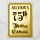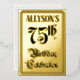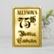 The front of this ornate and elaborate seventy-fifth birthday party/celebration foil invitation card design features the message “75th Birthday Celebration” in luxurious script-style text. It also has an editable name. The back features personalized details about the event, such as the date, time, place/venue, and any other important information. Fancy, opulent, customizable invitations like these might be used to invite guests to a birthday celebration/party being held to honour somebody’s 75th birthday. [~Z0000596]