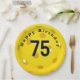 Close-up of a neon yellow pickleball for a 75th birthday.