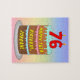 This cheerful and fun birthday themed jigsaw puzzle design features a cartoon-style depiction of a three-tier birthday cake having numeral-shaped candles on top showing the number “76“, along with the message “HAPPY 76TH BIRTHDAY,”, and a personalized recipient name. The background has a multi-colour pastel rainbow spectrum inspired gradient pattern. A colourful, customizable birthday puzzle like this might be used to celebrate somebody’s seventy-sixth birthday. [~Z0000621]