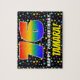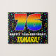 This upbeat and colourful birthday-themed jigsaw puzzle design features a large number “76” having a multicolored rainbow spectrum inspired gradient pattern. It also features the message “HAPPY 76th BIRTHDAY,”, and a customizable recipient name. The background has a bold, multicolored star shapes pattern. A joyful, personalized birthday puzzle like this might be a fun way to deliver birthday greetings to somebody who is celebrating their seventy-sixth birthday. [~Z0000607]