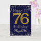 Happy Birthday with simulated golden glitter number 76 set on dark purple blue and framed by faux diamonds and rhinestones. Happy birthday and recipients name in off-white font. Personalize with name or message.