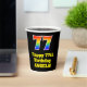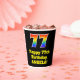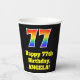 This exciting and fun birthday paper cup design features a large number “77” with a rainbow spectrum gradient inspired pattern, along with the message “Happy 77th Birthday,”, and an editable name. The background is coloured black. Colourful, vibrant paper cups like this might be fun to have at a birthday party being held to celebrate somebody’s seventy seventh birthday. [~Z0000537]