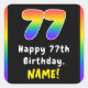 This joyful and fun birthday square sticker design features the number “77“ having a multicolor rainbow spectrum inspired gradient pattern, along with the message “Happy 77th Birthday,”, and a custom recipient name. Cheerful birthday themed stickers like these might be used or distributed at a birthday party for somebody who is celebrating their seventy seventh birthday, or perhaps used when wrapping gifts/presents or preparing invitations for such an event. [~Z0000630]