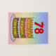 This upbeat and fun birthday themed jigsaw puzzle design features a cartoon-style depiction of a three-tier birthday cake having numeral-shaped candles on top showing the number “78“, along with the message “HAPPY 78TH BIRTHDAY,”, and a personalized recipient name. The background features a multi-colour pastel rainbow spectrum inspired gradient pattern. A cheerful, editable birthday puzzle like this might be a fun way to send birthday greetings to somebody who is celebrating their seventy-eighth birthday. [~Z0000621]