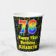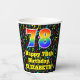 This fun and colourful music themed birthday paper cup design features a large number “78” having a rainbow spectrum gradient inspired pattern. It also features the message “Happy 78th Birthday,”, and a personalized name. The background features an exciting and colourful pattern of various music notes and symbols having a variety of colours and sizes. Colourful, vibrant paper cups like this might be fun to have at a birthday party being held in celebration of somebody’s 78th birthday. [~Z0000541]