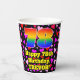 This joyful and cheerful birthday paper cup design features a large number “78” with a rainbow spectrum gradient inspired pattern, along with the message “Happy 78th Birthday,”, and a personalized name. The background features a pattern of heart shapes with colours like purple, red, and pink. Upbeat, fun paper cups like this might be fun to have at a birthday celebration being held to celebrate somebody’s 78th birthday. [~Z0000548]
