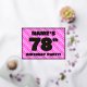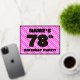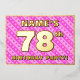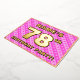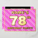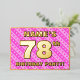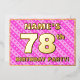 The front of this fun and upbeat seventy-eighth birthday celebration/party foil invitation card design features a customizable name, a large number “78th”, the message “BIRTHDAY PARTY!”, and a border. The background of the front has a joyful light pink and dark pink striped pattern, with heart shapes. The back features personalized details about the event, such as the date, time, location/venue, and any other relevant information. Personalized invitations like these might be a fun way to invite attendees/guests to a birthday gathering/party being held to honour somebody’s 78th birthday. [~Z0000603]