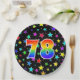 This fun, colourful, and cheerful paper plate design features a large number "78" containing a rainbow spectrum gradient inspired pattern. The background features a pattern of colourful star shapes. Paper plates like this might be fun to use at a celebration being held to honour somebody who is celebrating their seventy eighth birthday, or a couple’s seventy eighth anniversary, or some other 78th event. [~Z0000493]