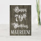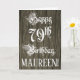 The front of this luxurious and fancy birthday themed greeting card design features the message “Happy 79th Birthday,” in elaborate script style text. The front also features a personalized recipient name, and a faux wood look inspired background pattern. The inside has a custom birthday greeting message, or could perhaps be cleared and left blank if a message is to be written by hand instead. An elegant, customized birthday greeting card like this might be sent in celebration of somebody’s seventy-ninth birthday. [~Z0000556]