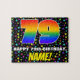 This upbeat and exciting birthday jigsaw puzzle design features a large number “79” with a multicolored rainbow spectrum inspired gradient pattern, along with the message “HAPPY 79th BIRTHDAY,”, and a customizable recipient name. The background features an eye-catching, colourful star field pattern. A bold, personalized birthday puzzle like this might be given in celebration of somebody’s seventy-ninth birthday. [~Z0000607]