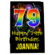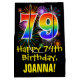 This colourful, exciting, and fun birthday-themed gift bag design features a large number "79" with a rainbow spectrum gradient style pattern, along with the message "Happy 79th Birthday,", and a personalized recipient name. It also has a colourful bursting celebratory fireworks inspired background pattern. A fun gift bag like this might be used when wrapping presents being given to somebody in celebration of their seventy ninth birthday. [~Z0000509]