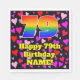 This fun and happy birthday paper napkin design features a large number “79” having a rainbow spectrum gradient inspired pattern. It also features the message “Happy 79th Birthday,”, and an editable name. The background features a pattern of purple, red, and pink heart shapes of various sizes. Happy, friendly paper napkins like this might be fun to use at a birthday celebration being held in celebration of somebody’s seventy ninth birthday. [~Z0000550]
