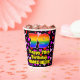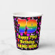This fun and happy birthday paper cup design features a large number “79” having a rainbow spectrum gradient inspired pattern. It also features the message “Happy 79th Birthday,”, and an editable name. The background features a pattern of pink, red, and purple heart shapes. Happy, cheerful paper cups like this might be fun to use at a birthday celebration/party being held to celebrate somebody’s 79th birthday. [~Z0000548]