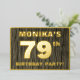 The front of this bold seventy-ninth birthday celebration/party foil invitation card features an editable name, a large number “79th”, the message “BIRTHDAY PARTY!”, and a border, all in foil. The background of the front features a rustic, yet elegant, faux wood grain look inspired pattern. The back features personalized details about the event, such as the date, time, venue, and any other important information. Customizable invitations like these might be used to invite attendees to a birthday gathering/party being held in celebration of somebody’s 79th birthday. [~Z0000598]