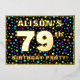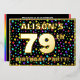 The front of this joyful seventy-ninth birthday party/celebration foil invitation card design features a custom name, a large number “79th”, the message “BIRTHDAY PARTY!”, and a border. The background of the front features an upbeat, multicolored star shapes pattern. The back features personalized details about the event, such as the date, time, place/venue, and any other useful information. Customized invitations like these might be a fun way to invite guests to a birthday party being held in celebration of somebody’s 79th birthday. [~Z0000600]