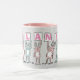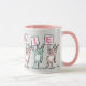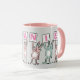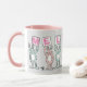 Fun Rabbit Design Mug for someone with a 7 Letter Name. Fun pinks and white Mug with illustration of Rabbits in pink and blue. The rabbits are holding up cards to spell out the name. Example name is Melanie. Cute baby rabbits.