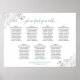 This beautiful wedding seating chart includes seating for 7 tables or 70 guests with 10 seats per table. The chic sophisticated design is simple yet elegant with dark grey and teal or turquoise text on a white background. The title reads: "please find your table" in a lacy script calligraphy and the corners are decorated with silver faux foil frills in a delicate floral pattern. Wonderful way to help your guests find their tables at your reception while adding a touch of style.