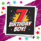 This cool 7th birthday boy design is perfect for a superhero birthday party theme! Great for any 7 year old boy that loves comic book superheroes or villains with superpowers! Features 7th birthday '7 Birthday Boy!' happy birthday quote in a comic book superhero theme that the 7 year old super birthday boy will LOVE!