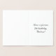 The front of this elaborate and formal birthday themed foil greeting card design features the message “Happy 7th Birthday,” in ornate script style text. The inside has a personalized birthday greeting message, or could perhaps be cleared and left blank if a message is to be written by hand instead. A luxurious, customizable birthday greeting card like this might be used to acknowledge somebody’s seventh birthday. [~Z0000555]