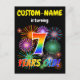 The front of this lively and fun birthday party invitation postcard design features a personalized name, an exciting bursting celebratory fireworks inspired pattern, and the message "7 YEARS OLD!" having a colourful rainbow spectrum inspired gradient pattern. The back features a personalized message that could describe when and where the party is being held, in addition to other relevant information. Invitation postcards like this might be sent to potential attendees of a birthday party being held in celebration of somebody’s seventh birthday. [~Z0000452]