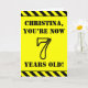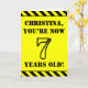The front of this attention-grabbing and fun birthday themed greeting card design features a customizable name and the message "YOU’RE NOW 7 YEARS OLD!" in black stencil style text on a yellow coloured background. There is also an eye-catching black and yellow striped pattern at the top and bottom edges of the front. The inside features a custom birthday greeting message, or could perhaps be cleared and left blank if a message is to be written by hand instead. A personalized birthday card like this might be a fun way to send birthday wishes to somebody who is celebrating their seventh birthday. [~Z0000413]