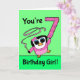 Our little penguin friend is wishing a special little gymnast a happy 7th birthday! She's performing in her pink leotard with ribbon and balancing a big pink confetti number 7. Card background is a fun green. Original illustration by Bethany J. Mitchell of Darcy Place Studio.