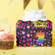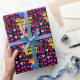 This cheerful and happy birthday-themed wrapping paper design features a large number “7” with a rainbow spectrum gradient inspired pattern, along with the message “Happy 7th Birthday,”, and a personalized name. The background features a pattern of pink, red, and purple heart shapes of various sizes. Personalized birthday themed wrapping paper like this might be used when giving a gift or present in celebration of somebody’s seventh birthday. [~Z0000549]
