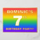 The front of this vibrant seventh birthday party foil invitation card design features a customizable name, a large number “7th”, the message “BIRTHDAY PARTY!”, and a border. The background of the front has a fun, multicolored, rainbow spectrum inspired gradient pattern. The back features personalized details about the event, such as the date, time, location/venue, and any other important information. Personalized invitations like these might be a fun way to invite attendees to a birthday party being held in celebration of somebody’s 7th birthday. [~Z0000599]