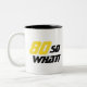 80 So what Inspirational Funny 80th Birthday Two-Tone Coffee Mug. A great birthday gift idea for a man or a woman who celebrates 80th birthday and has a sense of humour. The text reads 80 So what - you can change the age number. The text is in yellow and black. Great present for 80 years old woman or man.