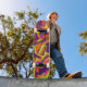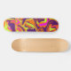 This skateboard deck features a pour art inspired psychedelic marble design using the cartoon inspired colours: purple, orange, yellow and pink.