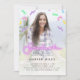 Graduation photo invitation, featuring a retro 1980s pastel pattern and pink neon "graduation" script. Suitable for the high school or college graduate. Can be used as a graduation thank you card or grad party invitation.