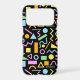 1980s style pattern in colorful shapes of green, yellow, blue and yellow on a black background.