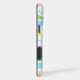 1980s style pattern in colorful shapes of green, yellow, blue and yellow on a white background.