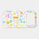 1980s style pattern in colorful shapes of green, yellow, blue and yellow on a white background.