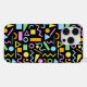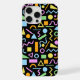 1980s style pattern in colourful shapes of green, yellow, blue and yellow on a black background.
