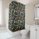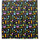 1980s style repeat pattern in colourful shapes of green, yellow, blue and yellow on a black background.