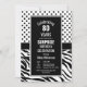 A black and white 80th surprise birthday party invitation featuring polka dots and zebra stripes.