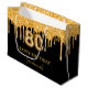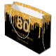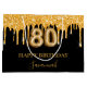 A chic black background. Decorated with faux gold glitter drips, paint dripping look. Personalize and add a name. With the text: Happy Birthday. The name is written with a mode hand lettered style script. Number 80 is written with a balloon style font.