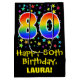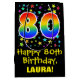 This vibrant, exciting, and fun birthday themed giftbag design features a large number "80" with a rainbow spectrum gradient style pattern, along with the message "Happy 80th Birthday,", and a personalized recipient name. It also has a colourful background pattern featuring star shapes of various sizes. A birthday themed gift-bag like this might be a fun way to wrap a gift or present being given to somebody who is celebrating their eightieth birthday. [~Z0000510]
