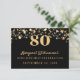Festive birthday celebration RSVP cards for any age featuring gold stars and string lights in your choice of colours (shown with gold text and black and gold background colours on the front and back for and 80th birthday). Make changes in EDIT. ASSISTANCE: For help with design modification or personalization, colour change, resizing, transferring the design to another product or if you would like coordinating items, contact the designer BEFORE ordering via Zazzle Chat or email makeitaboutyoustore@gmail.com.