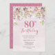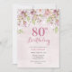 Lovely traditional 80th Birthday invitation with beautiful pink roses and magnolia and a simple patterned background.