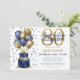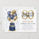 This fabulous men's 80th birthday party invitation featuring a 2-layer navy blue and gold cake with navy blue and gold balloons, the number 80 in gold and shiny blue confetti would be perfect for celebrating your loved one turning 80. It is traditional and classic while being fresh, modern and contemporary. The back is a coordinating navy blue foil.