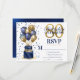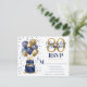 This fabulous men's 80th birthday party RSVP card featuring a 2-layer navy blue and gold cake with navy blue and gold balloons, the number 80 in gold and shiny blue confetti would be perfect for asking people to let you know if they will be attending the 80th Birthday Party and their entree choice(s). It is traditional and classic while being fresh, modern and contemporary. The back is a coordinating navy blue foil.