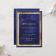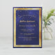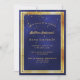A trendy, modern 80th birthday party invitation card for men, guys, male. A dark blue, navy blue background. The blue colour is uneven. With a faux gold frame and golden confetti sprinkle, golden coloured letters. Templates for your party information.