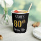 This luxurious and ornate birthday paper cup design features a personalized name and the message “80th Birthday Party”. The large number “80th” has an imitation/faux gold-inspired coloring pattern, the words “Birthday Party” are in elegant script-style text, and the background is colored black by default (although it can be customized). Opulent, elegant paper cups like this might be used at a birthday celebration/party being held in celebration of somebody’s eightieth birthday. [~Z0000567]