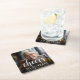 This custom 80th birthday paper coaster features the guest of honour's personalized photo, name, and birthday, along with the word "Cheers" in elegant white calligraphy script. A dark screen helps make the text pop. A great way to celebrate someone who's turning eighty!